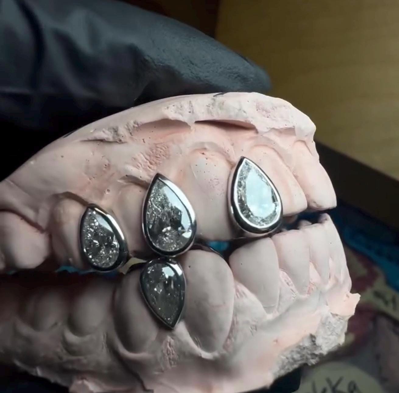 Custom Pear-Cut Diamond Grillz – Handcrafted in 925 Silver or Solid Gold with VVS Certified Stones Each grillz is meticulously handcrafted and made-to-order from your personal dental impression, guaranteeing an impeccable fit and superior comfort. This single cap design utilises 3X more metal than standard alternatives, delivering exceptional durability and refined craftsmanship. Select from premium materials: Solid Silver, or Genuine Gold in 10K, 14K, or 18K – available in Yellow, White, Rose, or Black Gold finishes. Our process begins with a complimentary mold kit sent upon order. After you return your impression, we'll approve it and commence production, typically completing your bespoke piece within 7–10 business days before shipping to you ready to wear. Browse our full collection for additional designs, or collaborate with us to realise your custom vision. Additional charges may apply for missing or broken teeth. Your satisfaction is guaranteed.