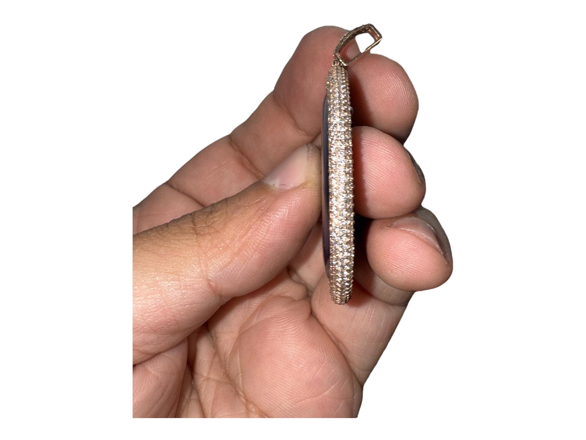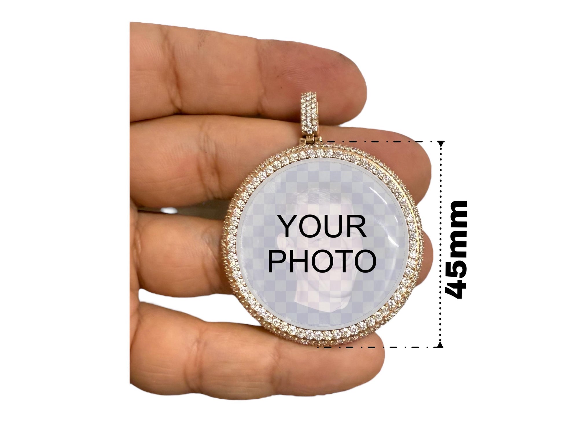Handcrafted round pendant featuring a striking moissanite halo of lab-grown stones set in your choice of 925 sterling silver or 9K-14K solid gold. This 45 mm statement piece showcases mirror-polished craftsmanship with a high-resolution photo sealed beneath a protective, waterproof surface—ideal for preserving cherished memories. The hypoallergenic, nickel-free design includes a polished bail compatible with chains up to 4 mm. Each pendant is made to order within 14 days and arrives presentation-ready in a matte black box with polishing cloth and care instructions. A meaningful keepsake for commemorative occasions or personal sentiment.