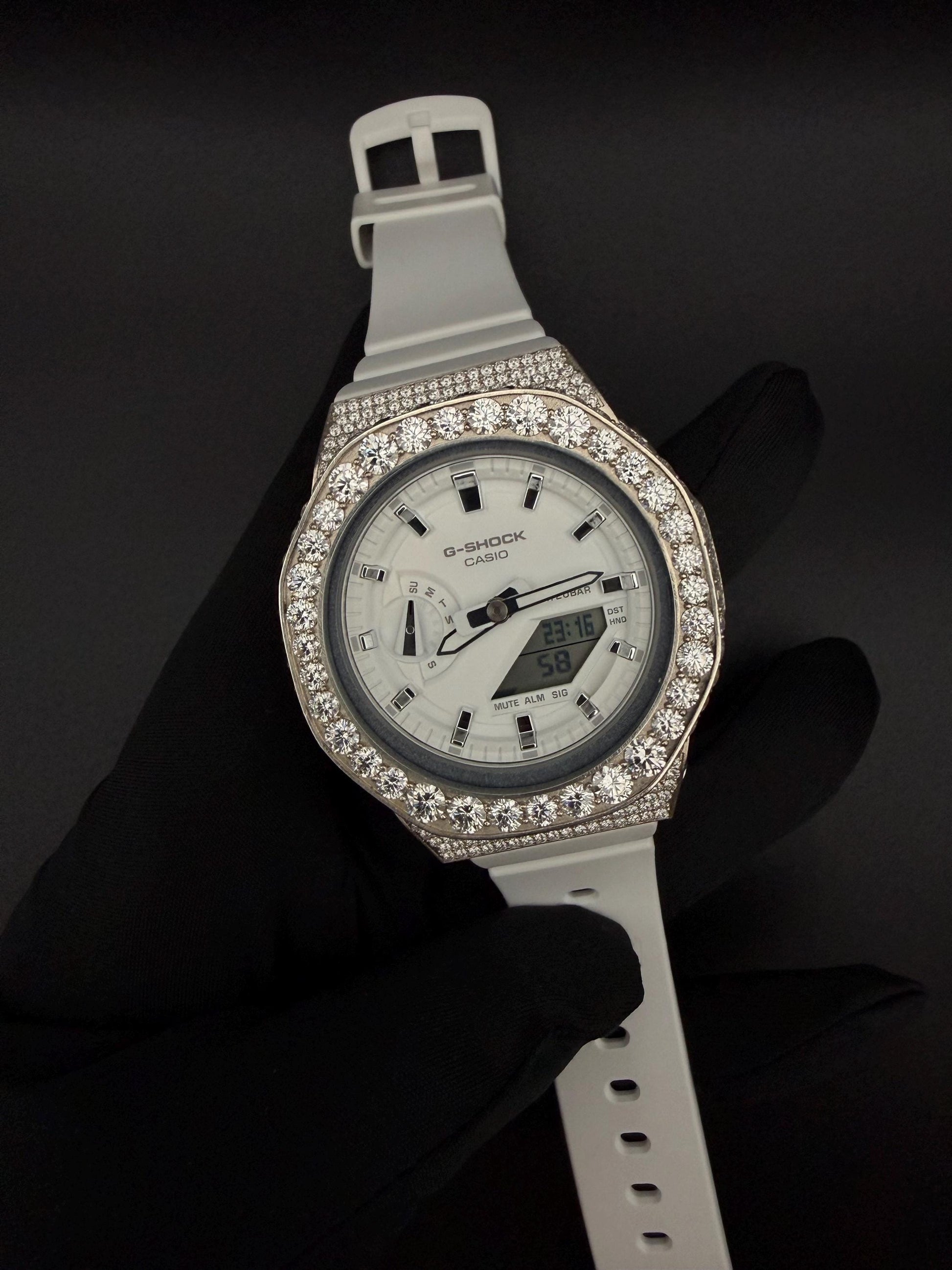 Elevate your timepiece with this bespoke iced-out G-Shock, meticulously crafted for those who demand exceptional quality and visual impact. Each VVS Moissanite stone is individually set by skilled artisans using secure prong-setting techniques, delivering uncompromising brilliance that rivals natural diamonds. The 925 sterling silver bezel and case provide substantial weight and enduring lustre, ensuring your investment maintains its premium appearance for years to come. Built upon an authentic G-Shock foundation, this custom creation combines technical reliability with luxury aesthetics. The substantial stone coverage creates a commanding presence on the wrist, while the water-resistant construction preserves the watch's functional integrity. An ideal acquisition for discerning collectors or as a distinguished gift for someone with refined taste in luxury accessories.